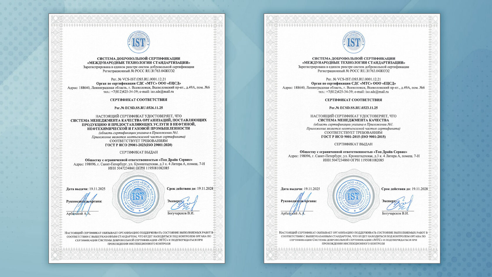 В целях развития системы управления организацией, а также наиболее полного удовлетворения требованиям заказчиков и поддержания у них доверия к компании, как к поставщику продукции и услуг высокого качества и надежности, компания ООО «ТопДрайвСервис» получила Сертификат соответствия требованиям ГОСТ Р ИСО 9001-2015 и Сертификат соответствия требованиям ГОСТ Р ИСО 29001-2023.